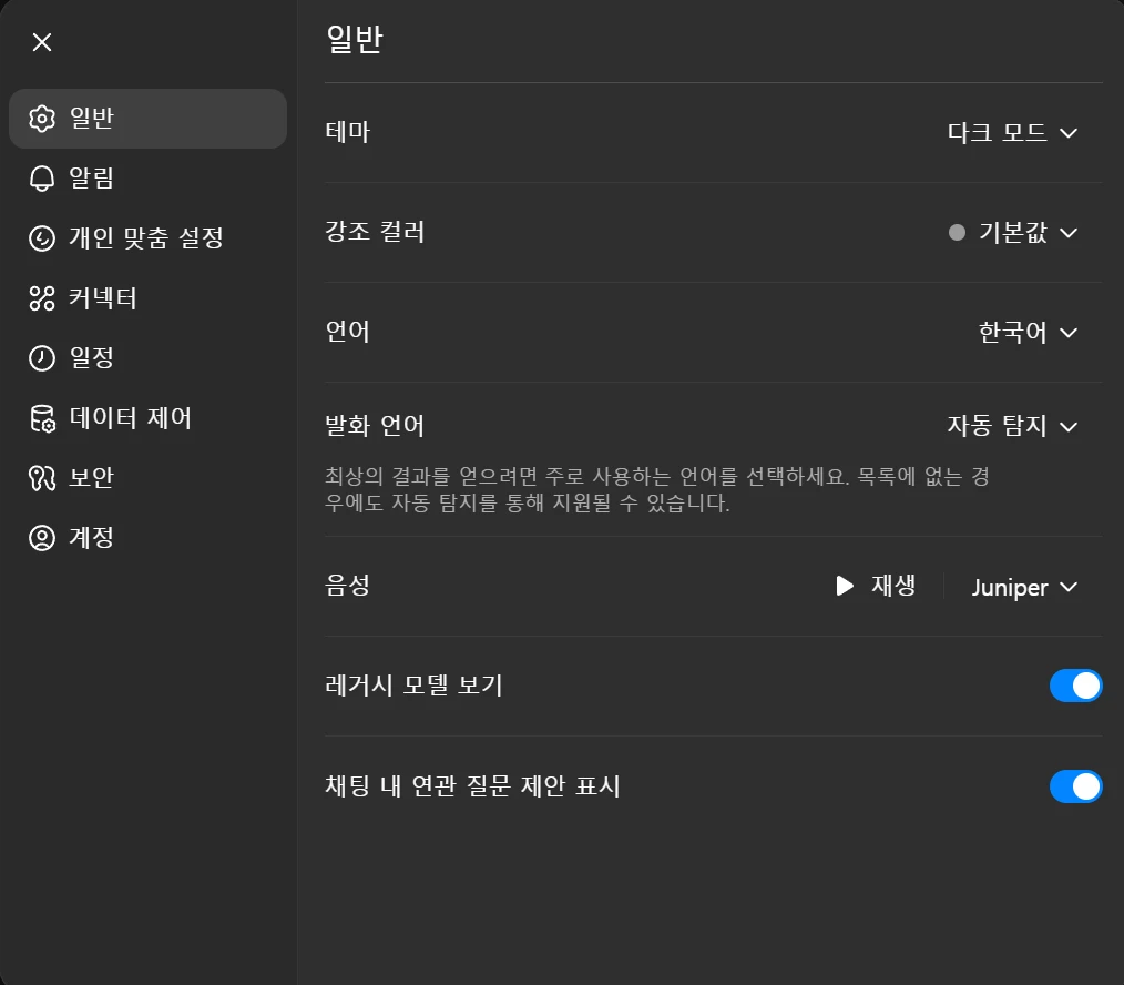 일반 탭에서 채팅 내 연관 질문 제안 표시를 꺼주면